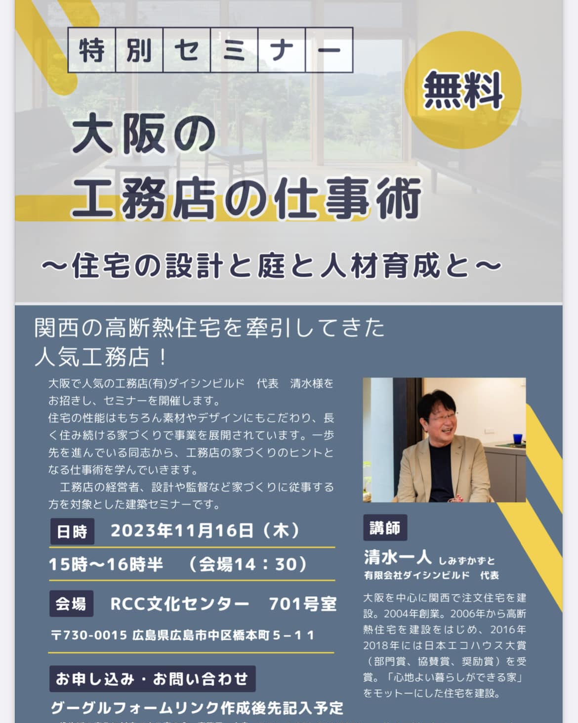 2023年11月、住生活の変化に対応できる家の会(広島)にて、「住宅の設計と庭と人材育成」をテーマに弊社代表清水が講演させていただきました。 50人入る会場は超満員、遠くは徳島からご来場いただきました。 ご参加くださった皆様、ありがとうございました。
